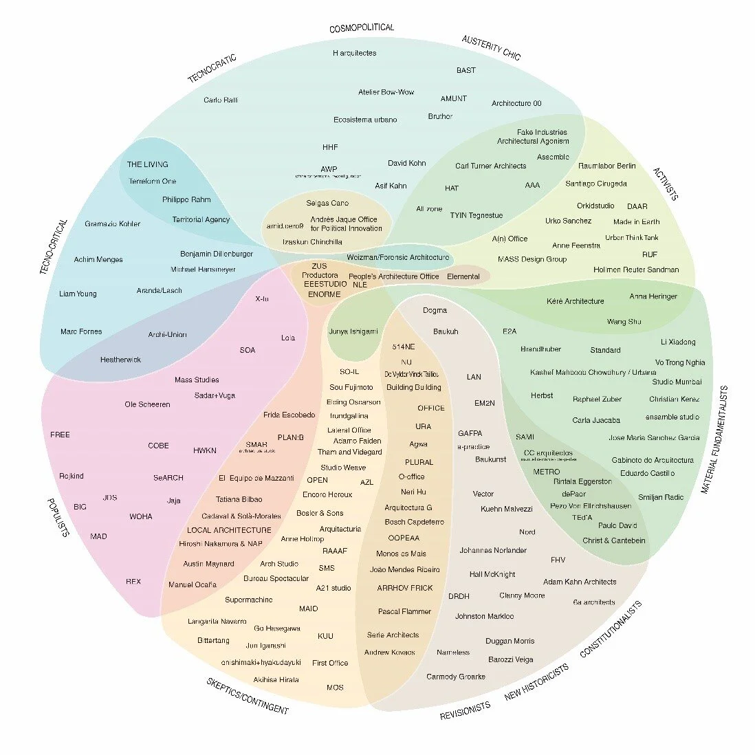 Perhaps one of the most interesting pieces of recent architectural analysis has been Alejandro Zaera Polo’s 2016 diagram (fig. 1): a matrix for reading contemporary design attitudes, or a section in time, as he calls it. The Political Compass of Architecture in 2016 is rich in groups of practices, and Zaera Polo distinguishes eleven categories and defines each of them in his 2016 article published in El Croquis. The crucial aspect of the diagram is that the architects represented in it are relatively young.