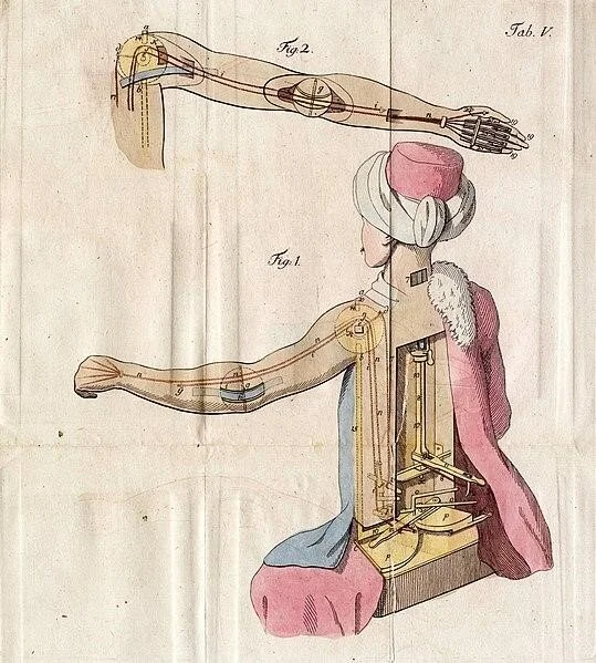 Post-humanity, as described by Žižek, is the cyborg-becoming of humans. This is not a new subject; the idea of machine-enhanced-humans has been around for centuries (think of the mechanical Turk or other similar inventions) (fig. 2) and reached a theoretical peak through cybernetics or Donna Haraway’s A Cyborg Manifesto (1985.) My intuition about why a focus on prosthetics might be fertile for architectural work to come is the “prospect of a direct link between our brain and digital machinery,”iv as Žižek puts it. This is not theoretical science; today, scientists can control a mouse’s movements and behavior by implanting a chip in its brain.v The catastrophically dystopian vision these brain/computer interface technologies point to does not change the fact that sooner, rather than later, they will become part of our daily lives.
